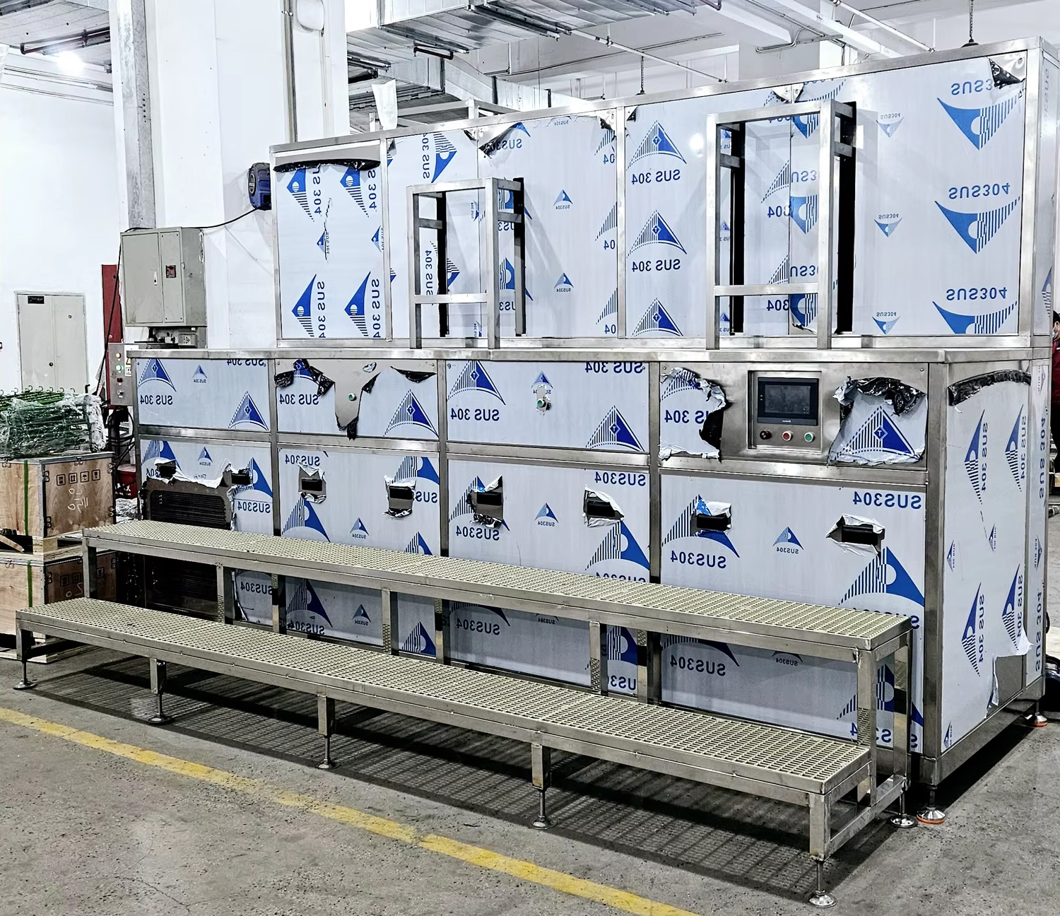 - Vỏ máy SUS304, khung 40×40×2 mm, kích thước tổng thể 4100 × 1200 × 2000 mm.