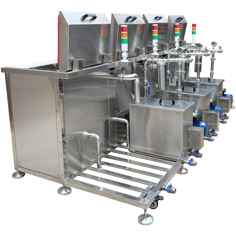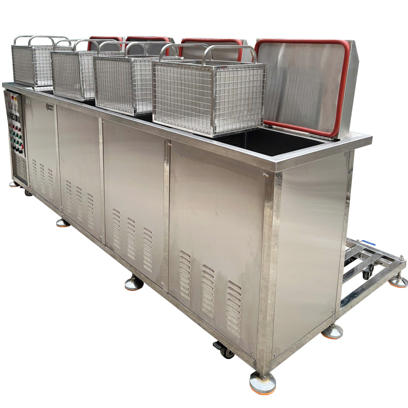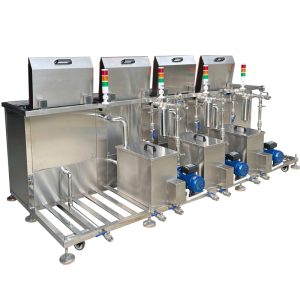 • Hệ thống rửa siêu âm liên hoàn UTS: Có thể là bể đơn, bể đôi, hoặc bể ba nhưng được tích hợp thêm hệ thống nâng hạ bằng máy tời treo có bánh xe hoặc cố định, hay tích hợp hệ thống điều khiển rửa tự động (Automation Line). Đối với hệ thống làm sạch tự động thường thích hợp với các quy mô làm sạch bản mạch, sản phẩm CNC, sản phẩm yêu cầu đặc biệt. Với loại tời nâng thường sử dụng cho rửa đầu máy, khuôn đúc hoặc những vậy có kích thước lớn, khối lượng rửa nhiều.
